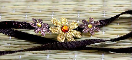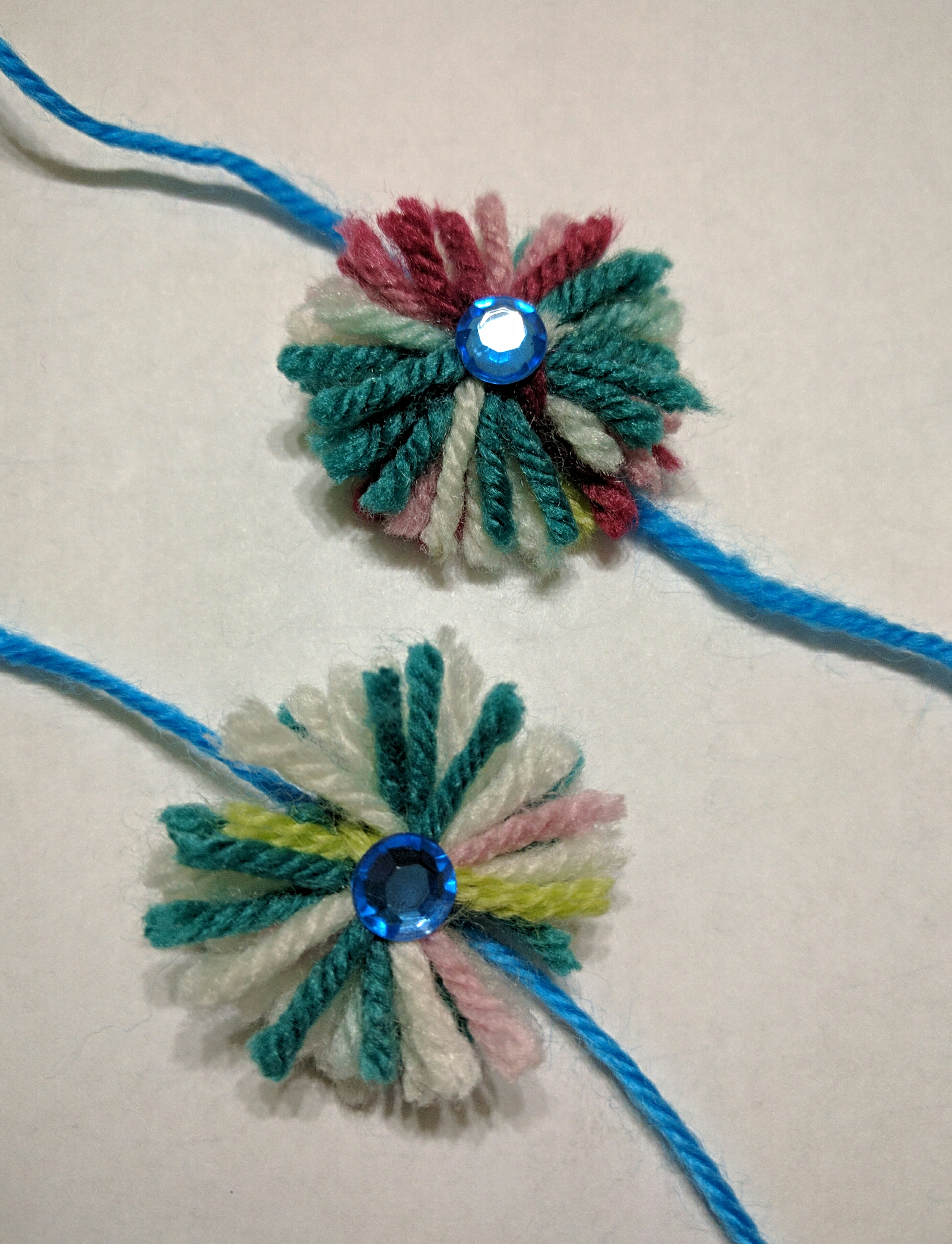 Next we used some 3D stickers that were left over from a party. You can easily get these at Michaels or Dollar Store. Just stick them to a matching ribbon and you’ll have a cute Rakhi that even sisters would like to wear.