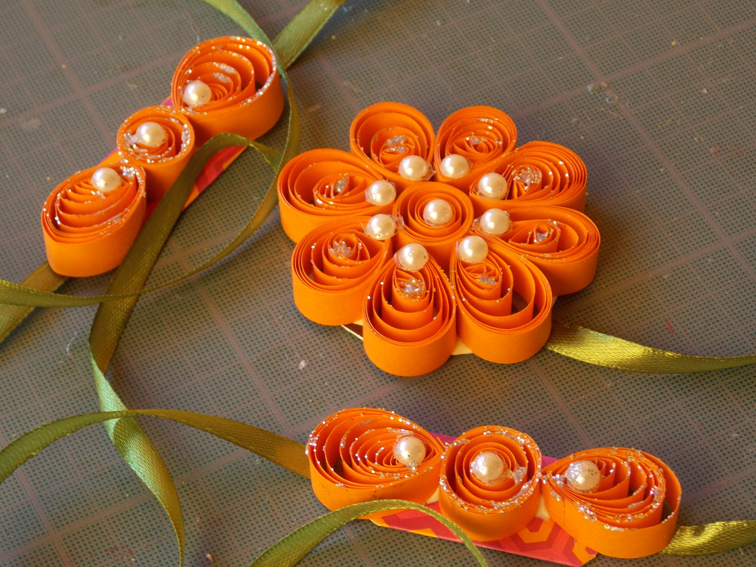Next up is the Paper-Quill rakhi. Ritika recently elarned the quilling technique at her art class, and loves making flowes with it. You could easily assemble a gorgeous flower rakhi, similar to the one below. You can make any shapes that you like, and use embellishments to add a glittery pop to them.